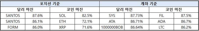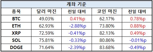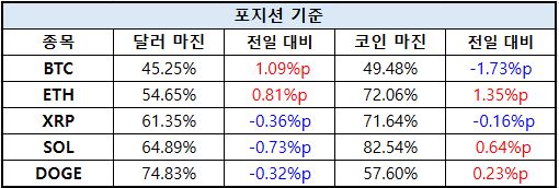 포지션 기준에서는 이더리움(ETH)이 코인 마진 비중이 72.06%로 높은 수준을 유지하는 가운데 전일 대비 1.35%p 상승하며 롱 심리가 강화된 모습이다. 반면 비트코인(BTC)은 코인 마진 비중이 49.48%로 내려오며 1.73%p 하락해 상대적으로 약세 흐름을 보였다. 솔라나(SOL)는 코인 마진이 82.54%로 높은 수준을 기록했지만 전일 대비 0.64%p 상승에 그치며 상승 탄력이 제한됐다.