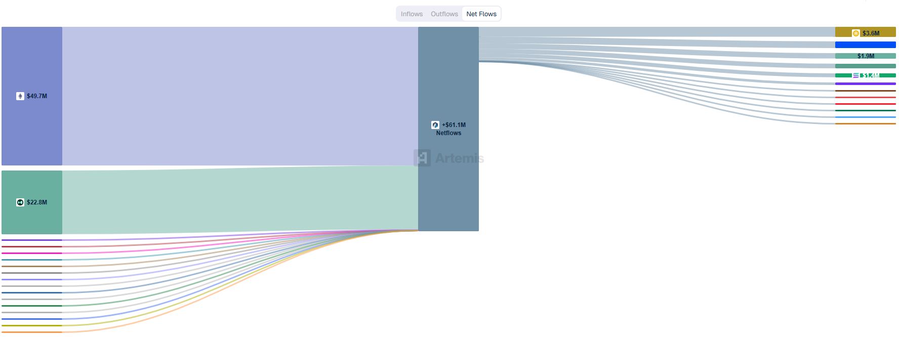 27일 기준 암호화폐 분석 플랫폼 아르테미스에 따르면 한 주간 가장 많은 브리지 자산 유입을 기록한 체인은 이더리움으로, 총 6억2072만 달러가 유입됐다.