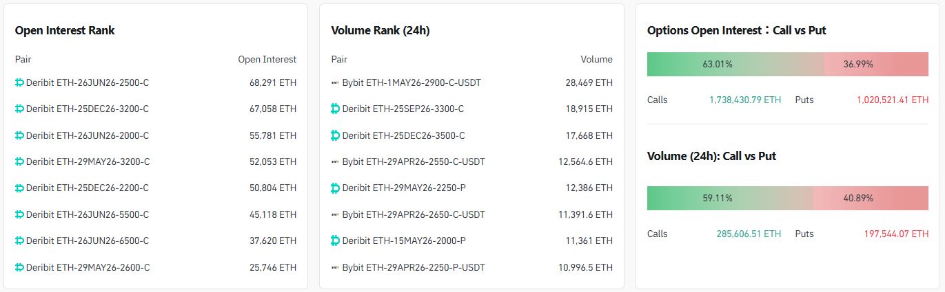 24시간 거래량 기준 상위 계약은 ▲2900달러 콜옵션(5월 1일·바이비트) ▲3300달러 콜옵션(9월 25일·데리비트) ▲3500달러 콜옵션(12월 25일·데리비트) 순으로 나타났다.