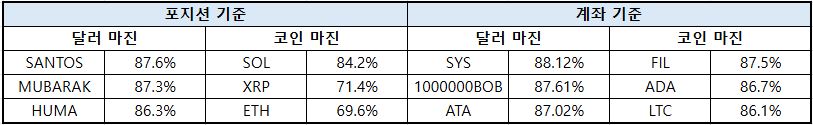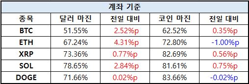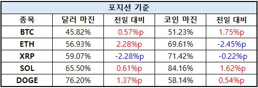 계좌 기준에서는 전반적으로 롱 비중 확대 흐름이 보다 뚜렷하게 나타났다. 비트코인은 달러 마진 기준 롱 비중이 51.55%로 상승(+2.52%p)했고, 코인 마진도 62.52%로 증가(+0.35%p)하며 투자자들의 매수 성향이 강화됐다. 특히 이더리움은 달러 마진 롱 비중이 67.24%로 크게 확대(+4.31%p)되며 가장 두드러진 증가세를 보였고, 코인 마진에서는 72.80%로 소폭 감소(-1.00%p)했다.