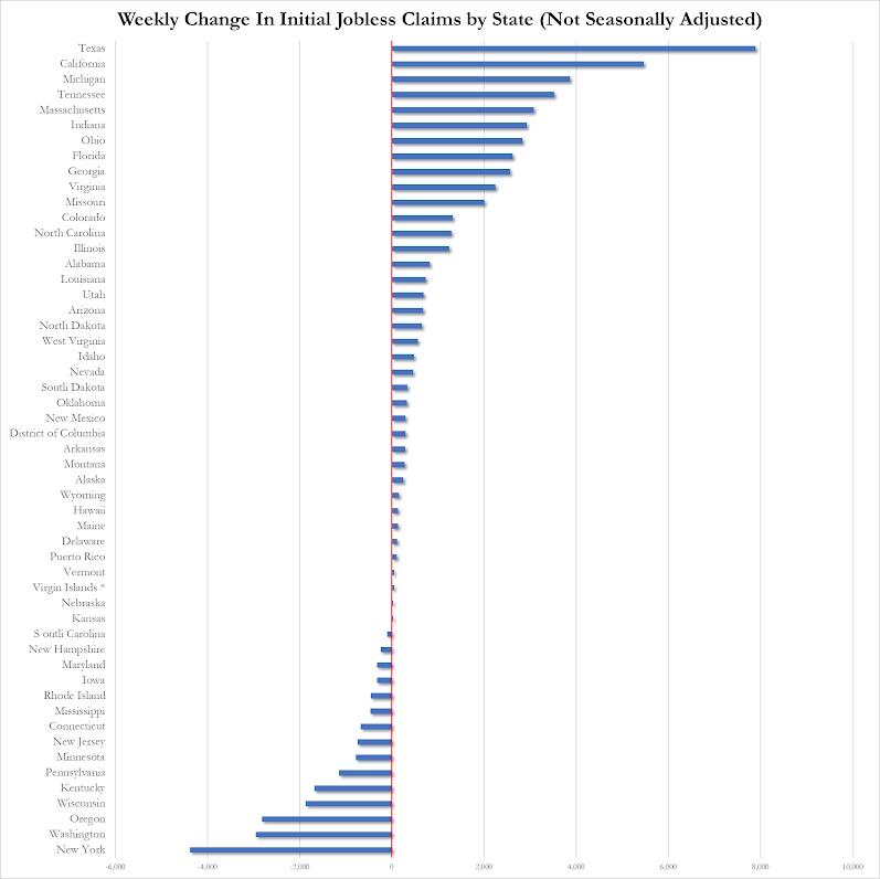 지역별로는 뉴욕주가 지난주 신규 청구 건수에서 가장 큰 감소폭을 보인 반면, 텍사스주는 가장 큰 증가폭을 기록하며 주별로 엇갈린 노동 시장 상황을 나타냈다.