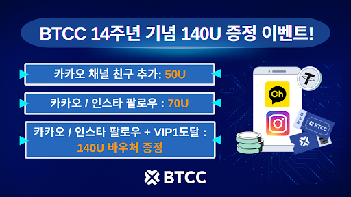 BTCC는 2025년 6월 설립 14주년을 맞아 한국 이용자를 위한 특별 이벤트를 진행하고 있다. BTCC 공식 소셜미디어를 팔로우하고 VIP1 등급을 달성하면 140USDT 바우처를 획득할 수 있는 기회를 제공한다.