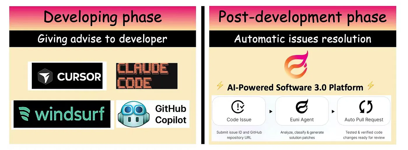 흥미롭게도 주류 시스템은 Python을 크게 선호하는 반면 다른 프로그래밍 언어에 대한 지원은 거의 제공하지 않는다. 대부분의 산업용 솔루션은 버그 수정에만 집중하고, 기능 요청, 문서화, Q&A와 같은 범주는 제외한다. IDE 확장 프로그램(예: GitHub Copilot), 전문 플랫폼(예: Cursor), 기초 모델(예: ChatGPT)이 현재 시장을 채우고 있지만, AI 기반 코딩 어시스턴트는 코딩 단계에서만 개발 워크플로우를 크게 강화한다. 개발자는 여전히 제안 사항을 확인해야 하므로 자율적인 해결은 여전히 어려운 실정이다.