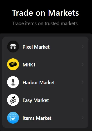 플레이어는 자신이 보유한 아이템을 수집·교환·전시할 수 있고, 이는 Dota 2나 Counter-Strike 2의 코스메틱 마켓과 유사한 구조를 따른다. 하지만 Not Games는 이러한 개념을 한 단계 발전시켜 중앙화된 단일 마켓 대신 텔레그램의 개방형 구조를 기반으로 다섯 개 이상의 독립 마켓이 동시에 운영되는 분산형 모델을 도입했다.