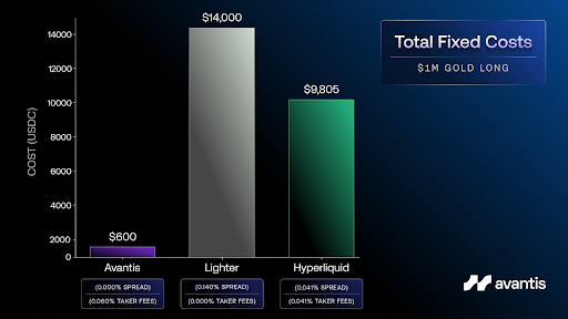 온체인 RWA(실물자산) 시장에서 골드(XAU) 거래 비용이 대폭 절감될 전망이다. Avantis가 금 선물 기반 거래에 제로 스프레드(Zero Spread) 방식을 도입하면서 대규모 주문을 사실상 슬리피지 없이 체결할 수 있는 환경이 마련됐다. 이를 설명하기 위해 Avantis 팀은 주요 퍼페추얼 DEX 간 비용 비교를 진행하며 “100만 달러 규모의 골드 롱 포지션을 열고 닫는 데 얼마가 드는가”라는 질문에 대한 수치를 공개했다.