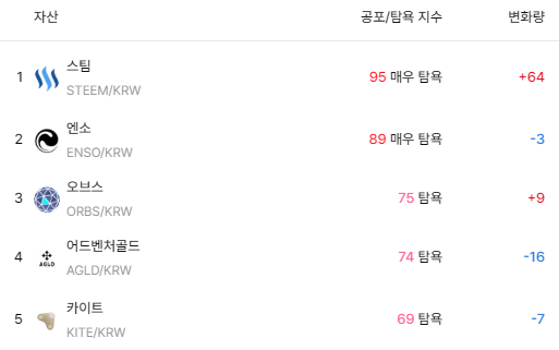 공포·탐욕지수에서도 스팀은 95포인트를 기록하며 ‘매우 탐욕’ 단계에 진입했다. 이는 전일 대비 64포인트 급등한 수치다. 엔소(89), 오브스(75), 어드벤처골드(74), 카이트(69) 등도 탐욕 구간에 위치했지만 상승 강도 면에서는 스팀이 가장 두드러졌다.