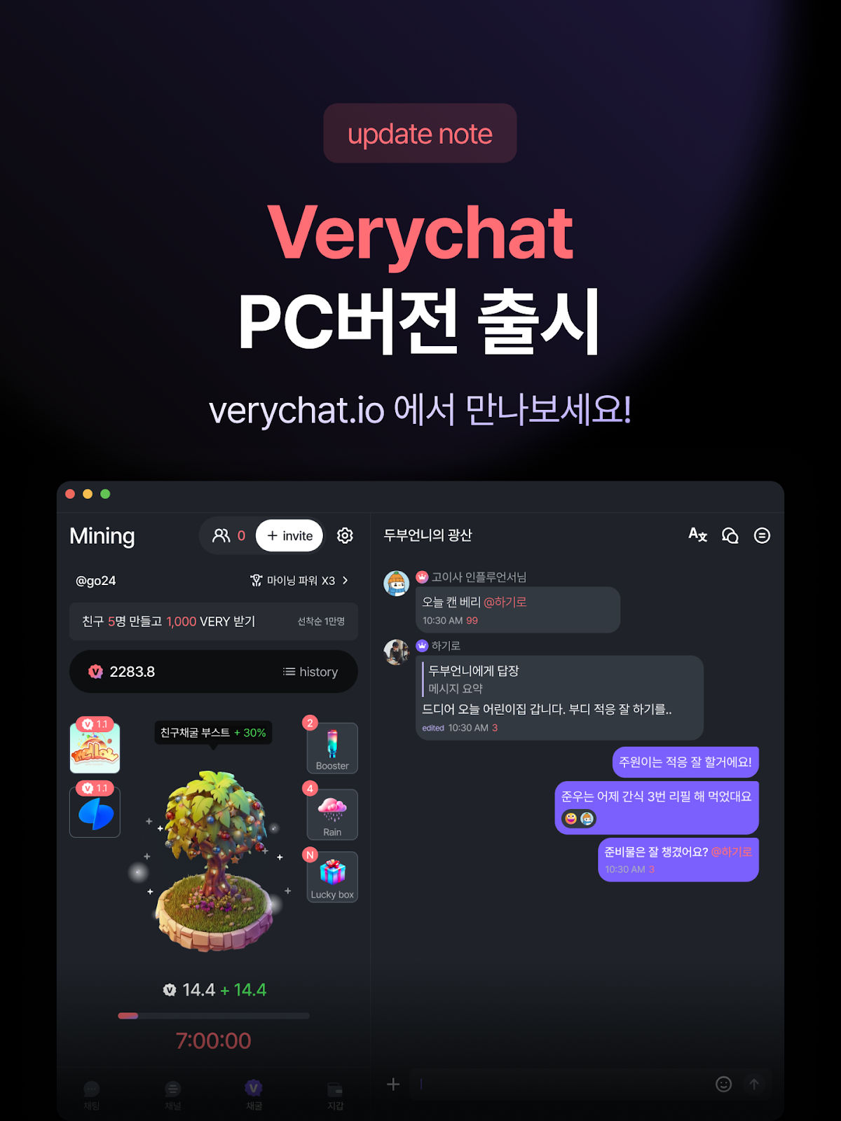 Web3 기반 글로벌 리워드 채팅 플랫폼 VeryChat을 운영하는 주식회사 베리챗은 Windows와 Mac(macOS)을 동시에 지원하는 PC 버전을 공식 출시했다고 밝혔다.
