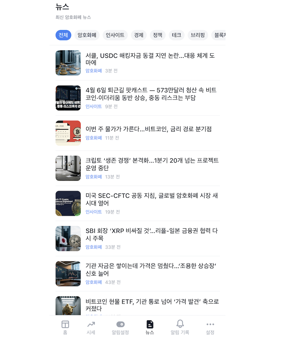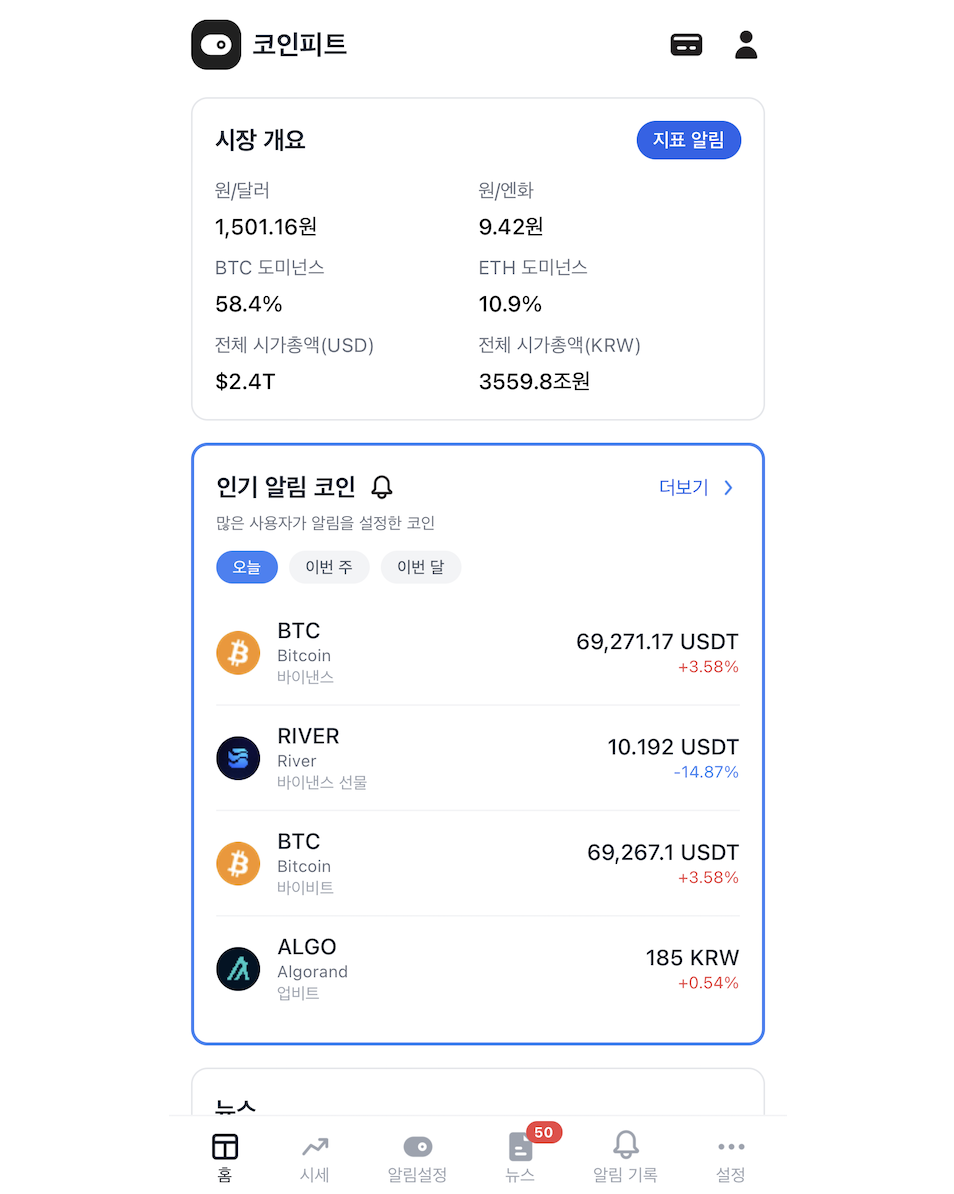 [코인피트 앱 내 신규 뉴스 섹션 화면]
