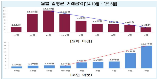 1일 금융정보분석원과 금융감독원이 공개한 '2025년 상반기 가상자산사업자 실태조사' 결과에 따르면 국내 가상자산 시장의 거래 규모와 원화예치금 등이 일제히 뒷걸음질쳤다.