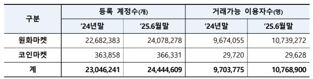 1일 금융정보분석원과 금융감독원이 공개한 '2025년 상반기 가상자산사업자 실태조사' 결과에 따르면 올해 상반기 기준 거래업자에 등록된 계정 수는 2,444만 개로, 지난해 말(2,304만 개) 대비 140만 개(6%) 늘었다.