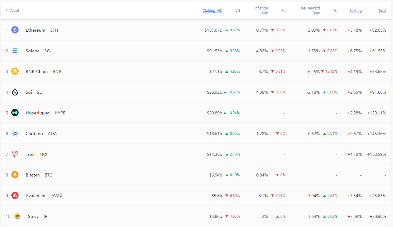 이어서 ▲솔라나(915억 달러, +9.28%) ▲BNB체인(271억 달러, +4.85%) ▲수이(269억 달러, +10.67%) ▲하이퍼리퀴드(209억 달러, +14.24%)가 스테이킹 시가총액 기준 상위권에 이름을 올렸다.