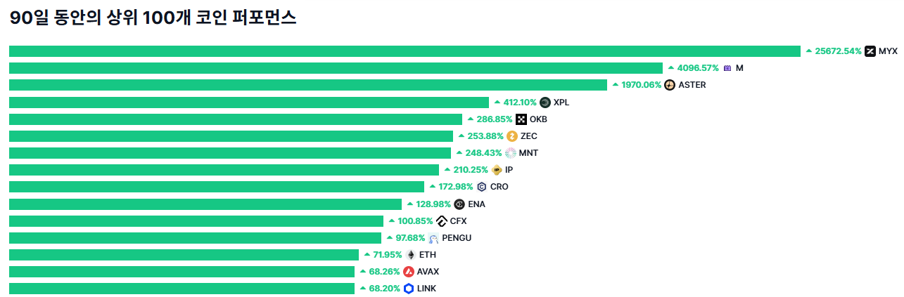 이어 밈코어(M, 4096.57%), 아스터(ASTER, 1970.06%), 플라즈마(XPL, 412.10%), OKB(286.85%), 지캐시(ZEC, 253.88%), 맨틀(MNT, 248.43%), 스토리(IP, 210.25%), 크로노스(CRO, 172.98%), 에세나(ENA, 128.98%), 콘플럭스(CFX, 100.85%), 펭구(PENGU, 97.68%), 이더리움(ETH, 71.95%), 아발란체(AVAX, 68.26%), 체인링크(LINK, 68.20%) 등이 강세를 나타냈다.