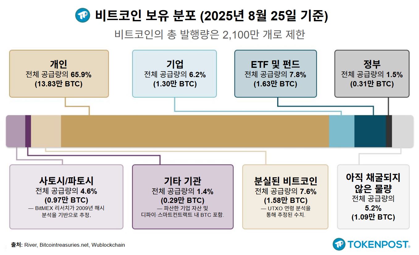 그 과정에서 주목해야 할 변화는 ‘소유의 이동’이다. 최근 통계에 따르면 현재 전체 비트코인 중 65.9%가 개인 투자자 손에 있다. 하지만 이 구도는 빠르게 바뀌고 있다. ETF, 헤지펀드, 기업금고, 정부가 잇달아 시장에 진입하면서 개인의 몫은 점점 줄고 있다. 초기 비트코인을 채굴해 장기 보유하던 ‘OG’들은 지갑을 열고 있고, 그 자리를 기관 자금이 채워가고 있다. 시장의 세대교체가 본격화된 것이다.