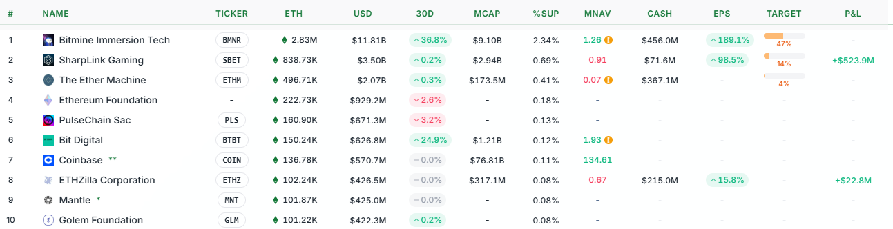 샤프링크 게이밍(SBET)은 83만8730 ETH(약 35억 달러)를 보유하며 2위를, 더 이더 머신(ETHM)은 49만6710 ETH(약 20억7000만 달러)를 보유하며 3위를 유지하고 있다.