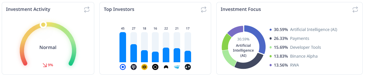 투자 집중 분야를 보면 인공지능(AI)이 전체의 30.59%를 차지하며 가장 높은 비중을 기록했다. 이어 ▲결제(26.33%) ▲개발자 도구(15.69%) ▲바이낸스 알파(13.83%) ▲RWA(13.56%) 순으로 나타났다.