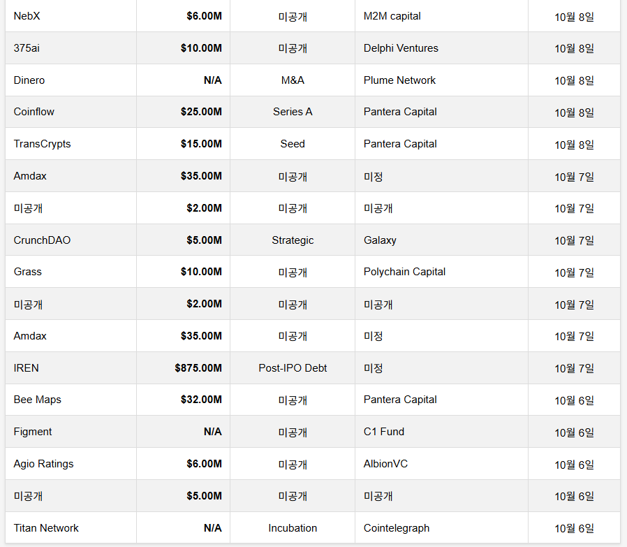 크립토랭크에 따르면 지난주(10월 6일~12일) 암호화폐 산업에서는 총 30건의 투자 라운드를 통해 35억1000만 달러(약 4조9840억 원) 규모의 신규 자금이 조달됐다.