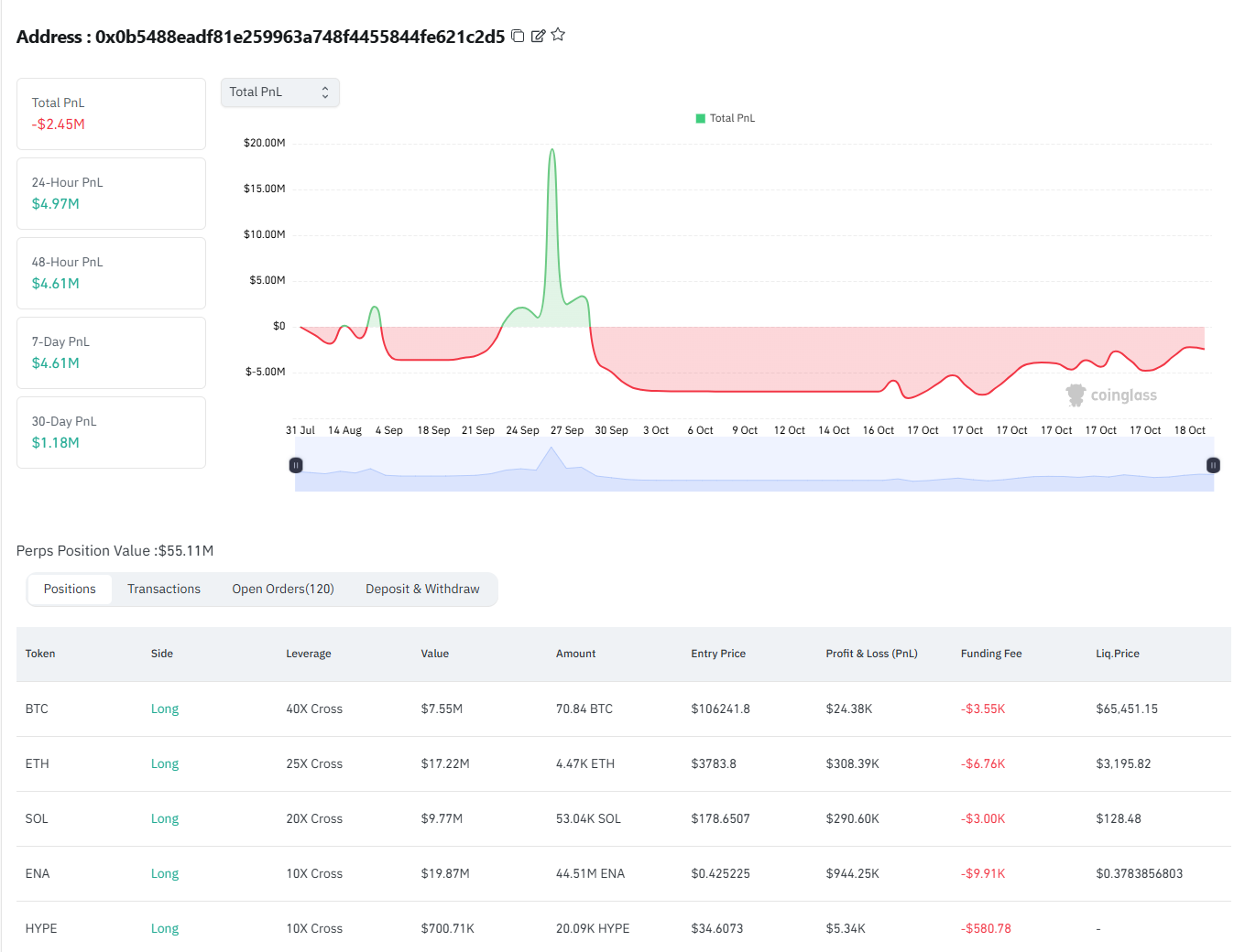 암호화폐 거래 추적 플랫폼에 따르면, 지갑 주소 0x0b5488eadf81e259963a748f4455844fe621c2d5는 최근 5개 종목에 대해 대규모 롱 포지션을 취했다. 주요 포지션은 다음과 같다.
