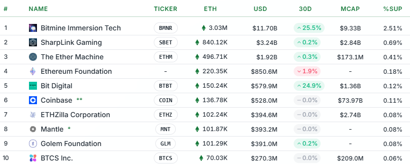 이어 코인베이스(COIN, 13만6780 ETH), 이더질라 코퍼레이션(ETHZ, 10만2240 ETH), 맨틀(MNT, 10만1870 ETH), 골렘 재단(GLM, 10만1290 ETH), BTCS Inc.(BTCS, 7만30 ETH)가 각각 6위부터 10위를 기록했다.