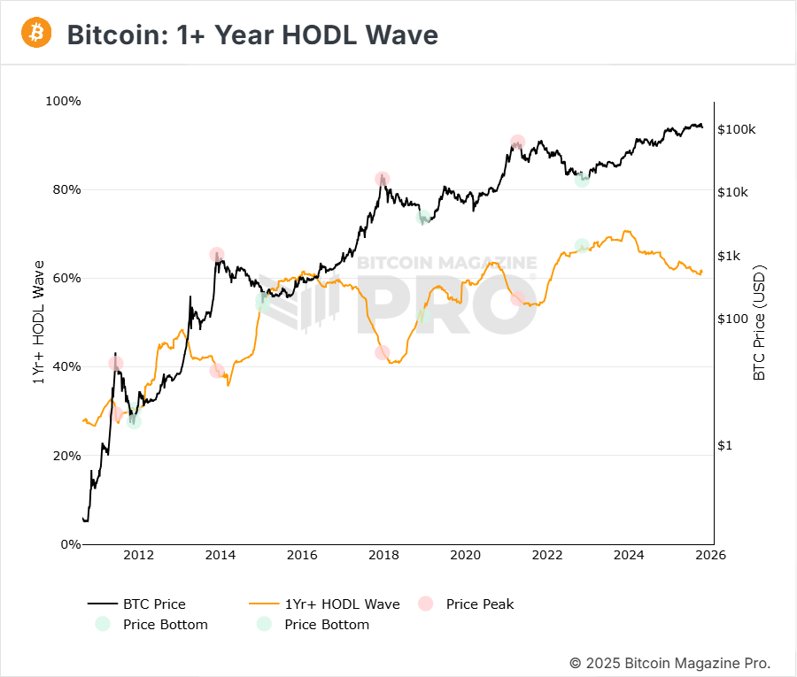 1+ Year HODL 웨이브는 61.56%로, 전주(60.80%) 대비 상승했다. 전체 비트코인 공급량 중 1년 이상 이동하지 않은 비중이 증가한 것은 장기 보유자들이 이익 실현을 자제하고 보유 전략을 유지하고 있음을 나타낸다.