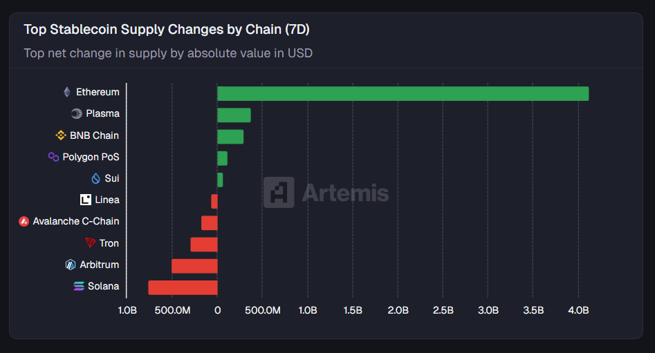 스테이블코인 공급이 가장 많이 증가한 블록체인은 이더리움이다. 약 41억 달러 규모의 공급 증가가 있었다.