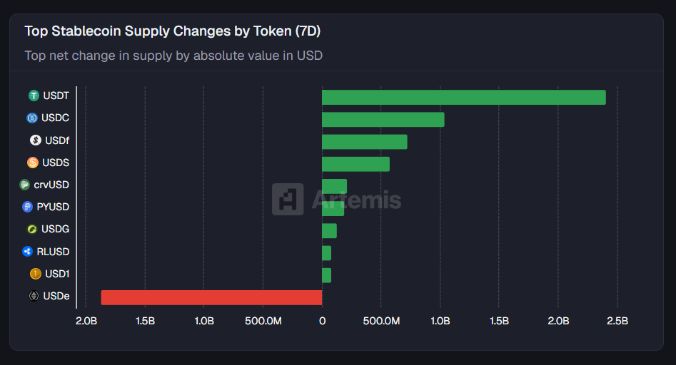 한 주간 USDT가 24억 달러 규모의 공급 증가를 기록하며 가장 큰 폭의 유입세를 보였다.