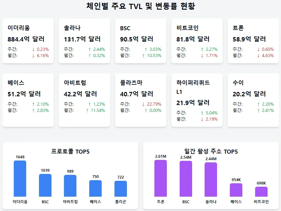 뒤이어 ▲솔라나(9.32%) ▲BSC(6.4%) ▲비트코인(5.79%) ▲트론(4.17%) ▲베이스(3.62%) ▲아비트럼(2.99%) ▲플라즈마(2.88%) ▲아발란체(1.34%) ▲폴리곤(0.9%) 순으로 나타났다.