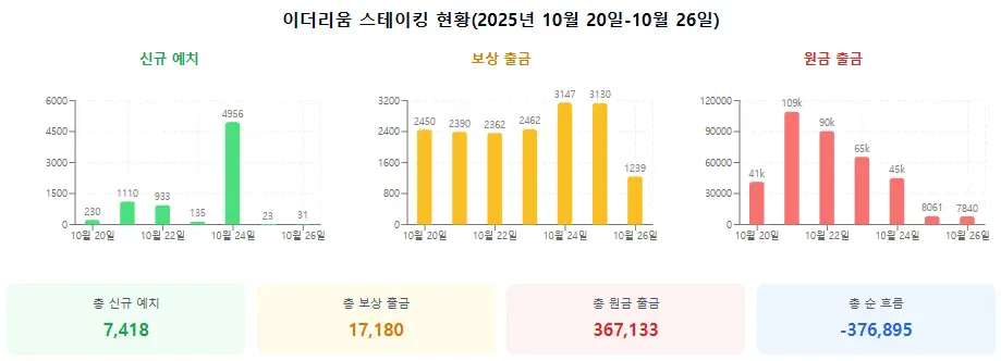 지난 24일 4956ETH, 21일 1110ETH의 신규 예치가 있었으나 전반적으로 매우 낮은 수준을 유지했다. 20일(230 ETH), 22일(933 ETH), 23일(135 ETH)에 이어 25일과 26일에는 각각 23ETH, 31ETH로 극도로 낮은 수준을 기록했다.