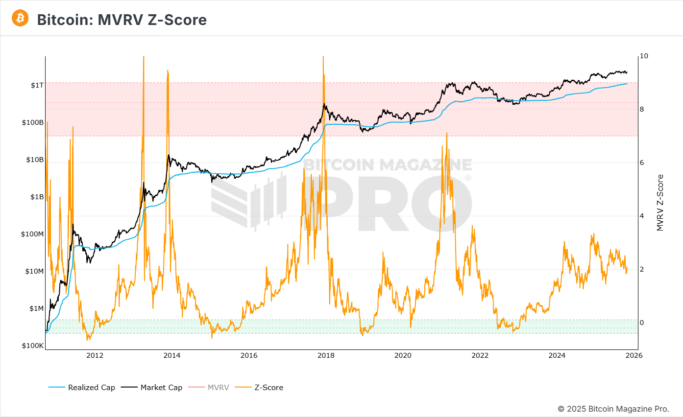 MVRV Z-스코어는 2.02로, 전주(1.89) 대비 상승했다. 시장 평균 매입가 대비 평가차익이 확대되며 단기 수익 실현 압력이 다소 높아진 상태다. Z-스코어가 중립선 상단(3 이하 구간) 에 근접하면서 시장 내 강세 심리가 살아나는 흐름을 보이고 있다.