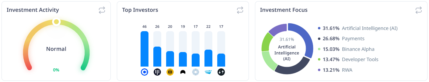 같은 기간 투자 집중 분야는 인공지능(AI)이 전체의 31.61%로 가장 높은 비중을 차지했다. 이어 ▲결제(26.68%) ▲바이낸스 알파(15.03%) ▲개발자 도구(13.47%) ▲RWA(13.21%) 순으로 나타났다.