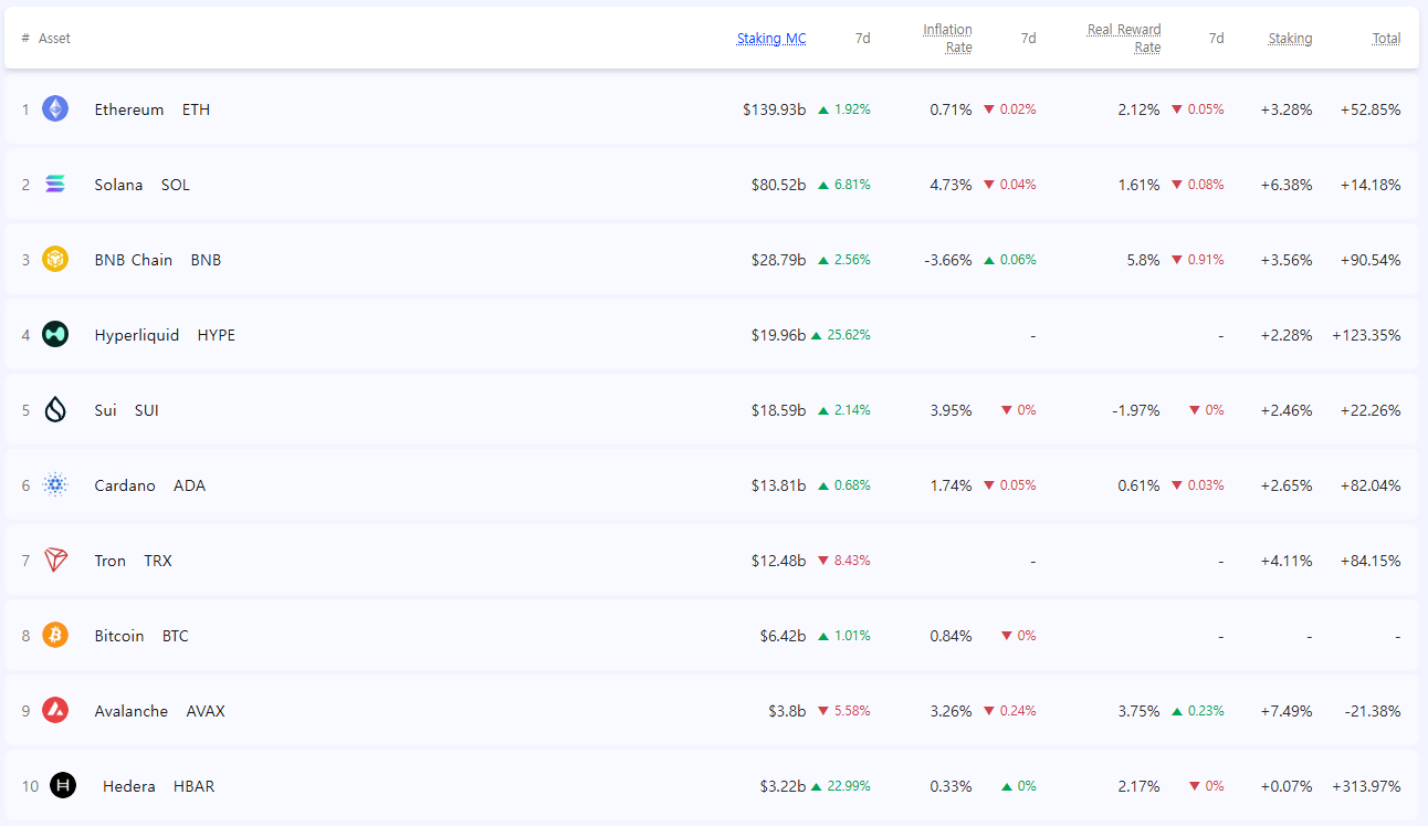 이더리움에 이어 ▲솔라나(805억 달러, +6.81%) ▲BNB체인(287억 달러, +2.56%)가 스테이킹 시총 기준 2, 3위를 차지했다.