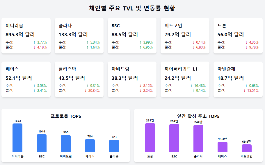 뒤이어 ▲솔라나(10.03%) ▲BSC(6.65%) ▲비트코인(5.95%) ▲트론(4.21%) ▲아비트럼(2.88%) ▲아발란체(1.4%) ▲폴리곤(1%) ▲볼타(Vaulta, 0.3%) ▲OP 메인넷(0.26%) 순으로 나타났다.
