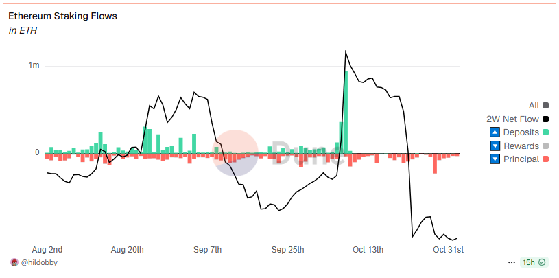 특히 10월 28일에 22만8800 ETH, 29일에 7만4396 ETH의 대규모 출금이 발생해 주간 총 순유출 규모를 크게 끌어올렸다.
