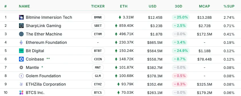 가장 많은 이더리움을 보유한 곳은 비트마인 이머전 테크(BMNR, 상장사)로, 331만 ETH(약 124억5000만 달러)를 보유하고 있다. 지난 25일 7만7100 ETH를 추가 매수하며 전체 이더리움 공급량의 2.74%를 차지하고 있다.