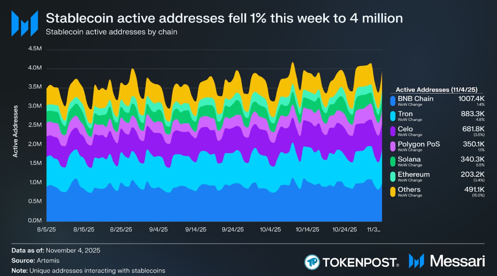 활성 주소 수는 전주 대비 1.1% 감소해 400만 개 수준을 기록했다. BNB 체인은 1.4% 하락한 100만 개, 트론은 4.8% 하락한 88만3천 개, 이더리움은 3.4% 감소한 20만3천 개로 집계됐다.