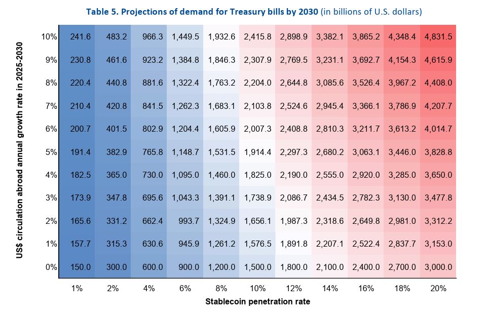 보고서는 2030년까지의 다양한 시나리오를 시뮬레이션했다. 미 달러 유통량이 연 6% 증가하고 스테이블코인 침투율이 10%에 도달할 경우, 스테이블코인 관련 국채 수요는 약 2조 달러로 급증한다. 이는 현재 외국 중앙은행 보유액의 약 4분의 1 수준이며, 미국 정부의 단기 부채조달 구조 자체를 바꿀 수 있는 규모다.