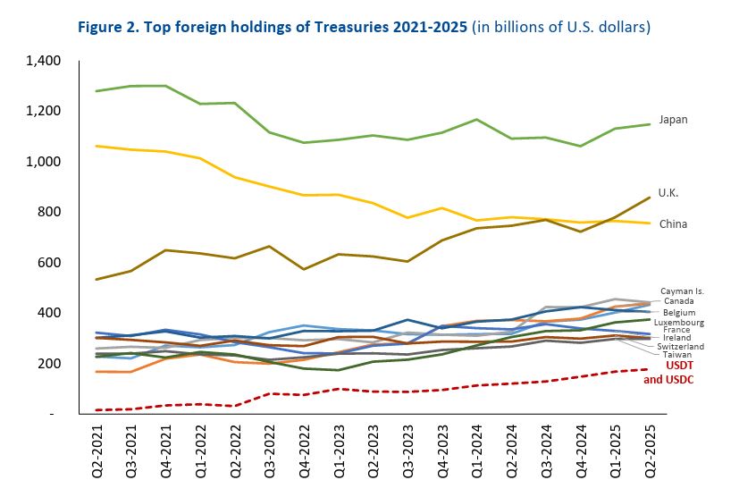 특히 테더의 국채 보유액은 2024년 말 기준 945억 달러로, 독일·UAE 등 중견국 수준이다. 보고서는 “스테이블코인 발행사가 단기 미채권 수요의 구조적 축으로 자리잡고 있다”고 분석한다. 이는 미국 재정조달의 안정성을 높이는 동시에, 암호화폐 시장의 불안정성이 국채금리로 전이될 수 있는 통로를 만든다는 점에서 양면적이다.