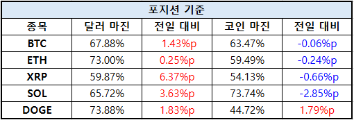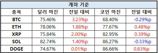 이더리움은 달러 마진 78.06%(+1.88%p), 코인 마진 77.67%(+0.48%p)로 두 시장 모두에서 매수세가 확대됐다. XRP는 달러 마진 75.84%(+2.00%p), 코인 마진 82.95%(+0.39%p)로, 전일 대비 고른 상승세를 보였다.