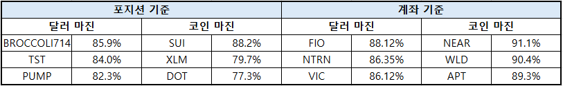 상위 트레이더 기준 종목별 포지션 비중을 보면, 포지션 기준 달러 마진 시장에서는 ▲BROCCOLI714(85.9%) ▲TST(84.0%) ▲PUMP(82.3%) 순으로 롱 포지션 비중이 높았다.