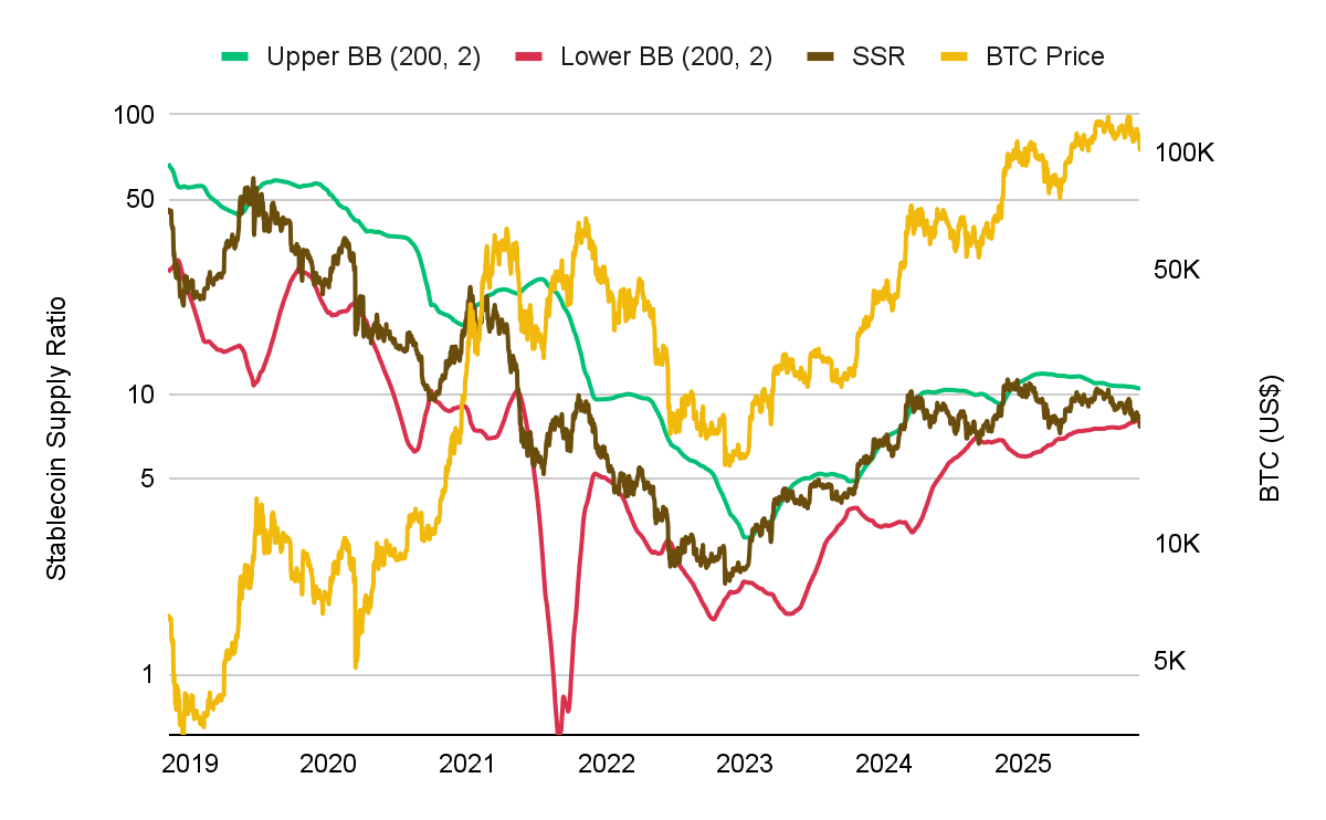 비트코인 등 변동성 자산에서 빠져나간 자금이 완전히 시장을 떠난 것이 아니라, USDT·USDC 등 스테이블코인 형태로 대기 중인 것이다. 이 비중을 보여주는 ‘SSR(Stablecoin Supply Ratio)’ 지표는 최근 급격히 낮아졌는데, 이는 “시장 내 대기 매수 여력이 높아졌음을 의미한다”고 토큰포스트 리서치는 해석했다.