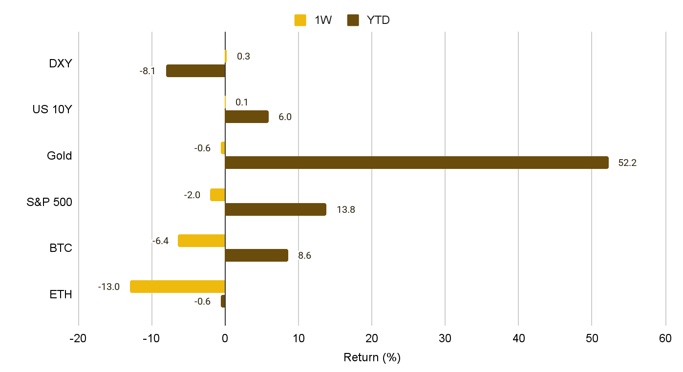 이번 주 글로벌 금융시장은 위험 회피 심리가 강하게 확산되며 한파를 맞았다. 비트코인은 주간 기준 6% 이상 하락했고, 미국 S&P500 지수 역시 2% 떨어졌다. 토큰포스트 리서치 분석에 따르면 이번 하락은 단순한 투자심리 위축을 넘어 기록적인 레버리지 청산과 외부 거시 변수의 충돌이 만든 ‘복합 충격’으로 풀이된다.