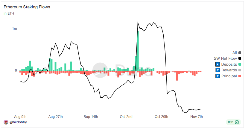 같은 기간 보상 출금은 1만5731 ETH로, 전주(1만6142 ETH) 대비 소폭 감소했다. 원금 출금은 37만7511 ETH로 집계됐다. 특히 5일과 6일 각각 10만1498 ETH, 11만2270 ETH 규모의 대규모 원금 출금이 발생하며 유출세를 주도했다. 역시 전주(49만3976 ETH) 대비 유출량이 다소 줄어들었다.
