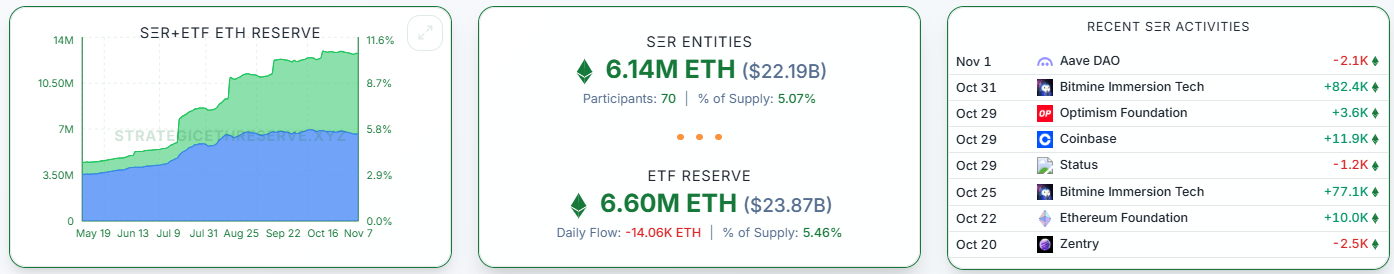 전략자산(SER) 보유 물량은 614만 ETH(221억9000만 달러)로, 전체 이더리움 공급량의 5.07%를 차지했다.