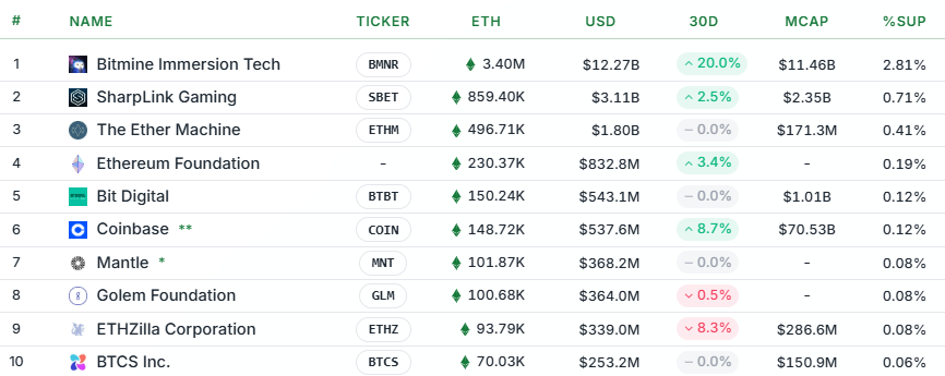 샤프링크 게이밍(SBET)은 85만9400 ETH(약 31억1000만 달러)를 보유하며 2위를 유지했다. 더 이더 머신(ETHM)은 49만6710 ETH(약 18억 달러)를 보유하며 3위에 올랐다.
