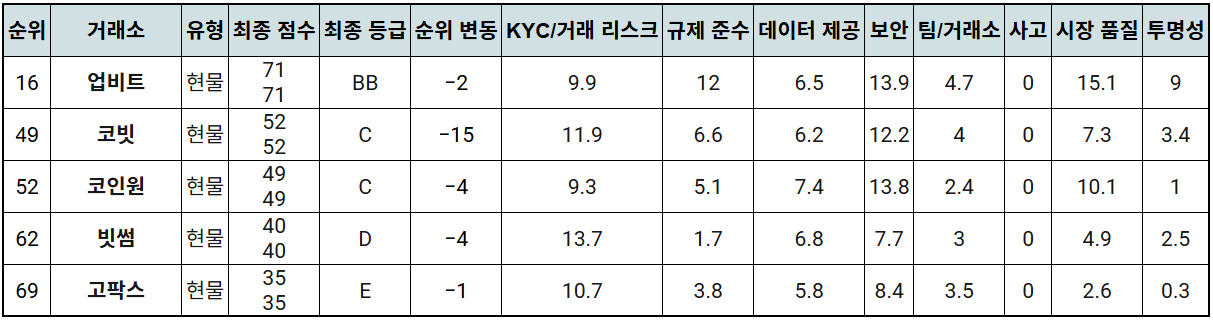코인원(52위, C등급, 49점)은 보안(7.4점)과 시장 품질(10.1점)에서 비교적 선전했으나 투명성(1점) 부문에서 극히 낮은 점수를 기록했다.