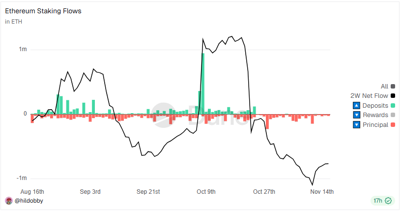 이더리움 스테이킹 시장이 약한 신규 유입과 큰 폭의 출금이 맞물린 가운데, 전체 유출 강도는 전주보다 완만해지는 흐름을 보이고 있다.