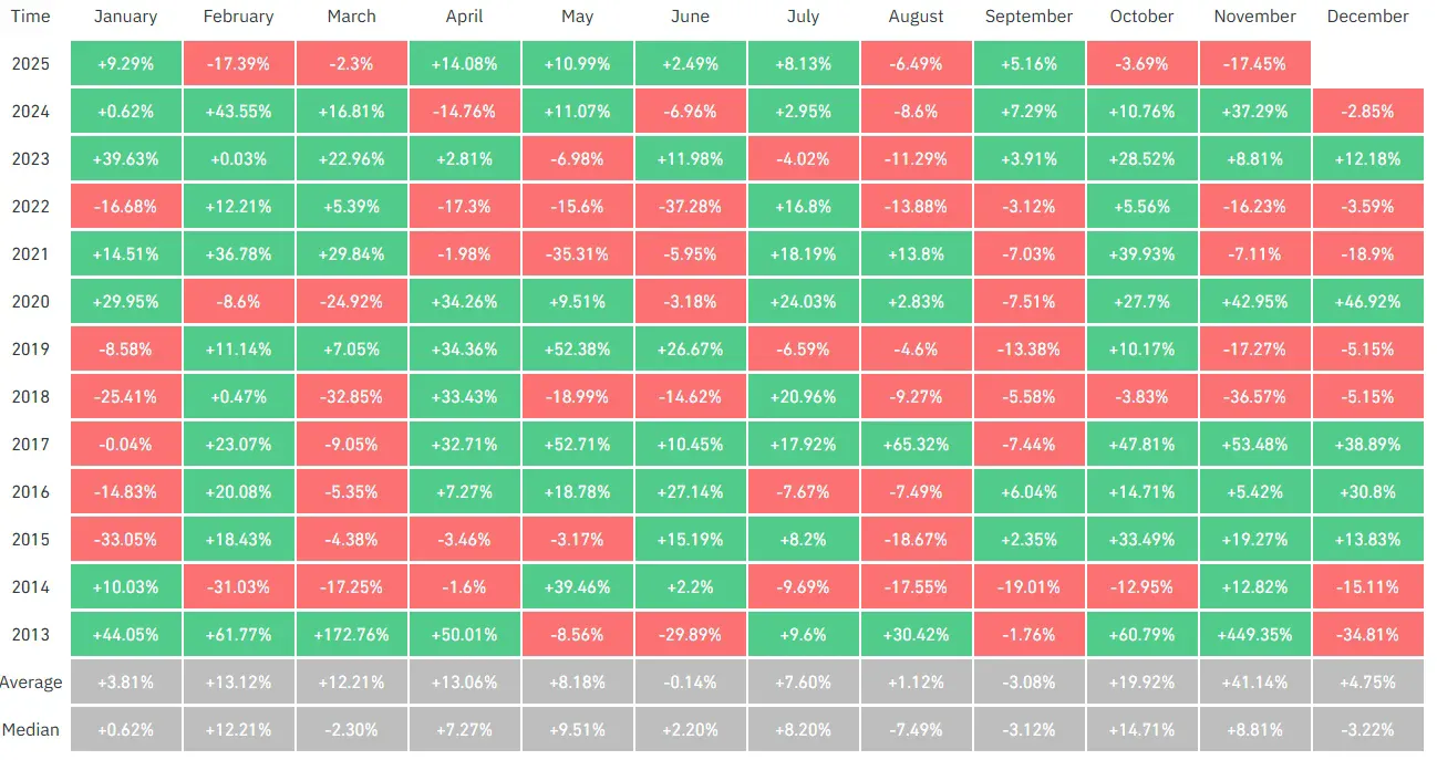 11월 현재까지 비트코인은 -17.45%의 월간 수익률을 기록 중이다. 11월 평균 수익률은 41.14%, 중앙값은 8.81%로, 12번 중 8번 상승 마감했다.