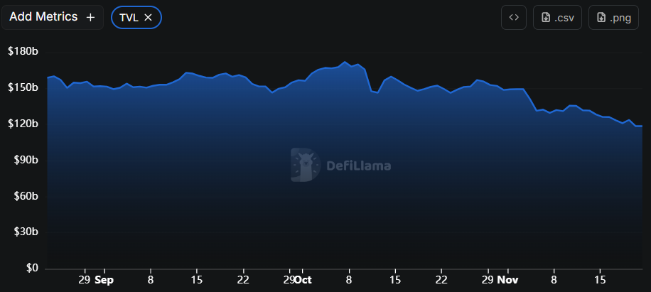 탈중앙화 금융(DeFi, 디파이) 생태계의 총예치액(TVL)이 1186억2000만 달러로 감소했다.