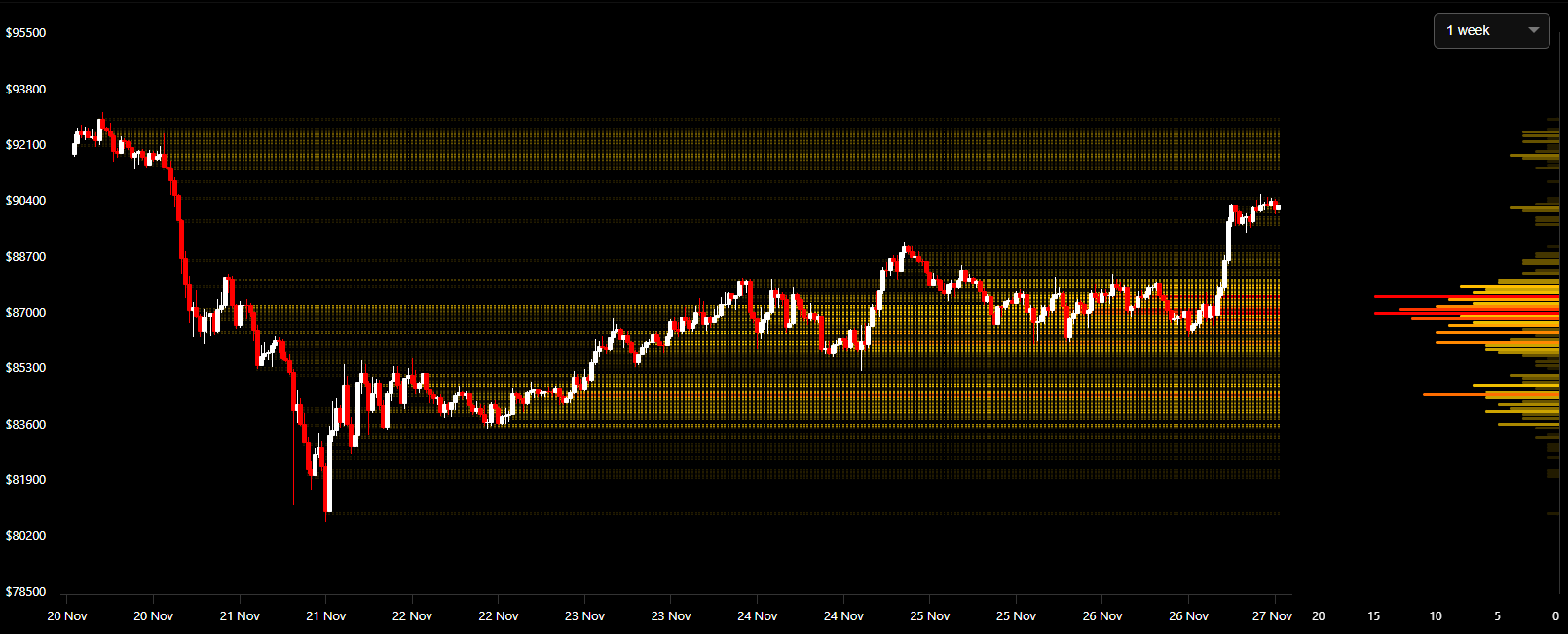 하단에서는 8만9000~8만9300달러 구간이 주요 매수 방어선으로 확인된다. 이 레벨은 최근 급락 상황에서도 고르게 매수세가 유입된 자리이며, 8만8650달러는 단기 구조의 최종 지지에 가깝다. 이 가격대가 무너지면 8만83xx~8만80xx달러까지의 조정 구간이 열리며 단기 추세가 크게 흔들릴 수 있다.