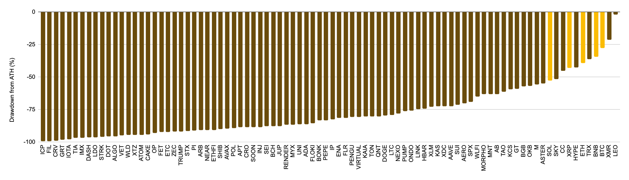 비트코인의 반등에도 불구하고 암호화폐 시장 내부는 '불균등한 회복' 양상을 보이고 있다. 시가총액 상위 1,000개 토큰 중 79개는 여전히 역대 최고점(ATH) 대비 50% 이상 하락한 상태인 것으로 나타났다.