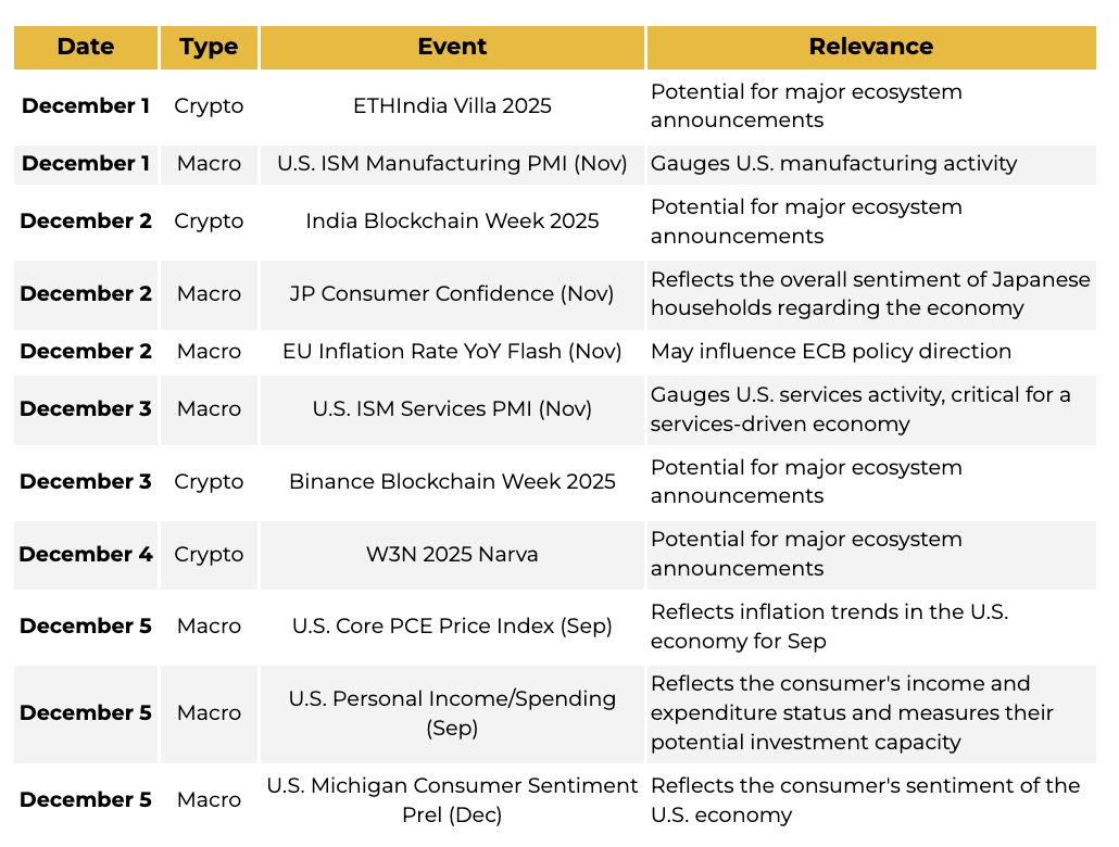 이번 주 주목해야 할 경제 지표로는 한국 ISM 제조업·서비스업 PMI와 유럽 물가지표 등이 있으며, 무엇보다 금요일 발표될 미국의 개인소비지출(PCE) 물가지수가 핵심이다. PCE는 연준이 인플레이션 판단 시 가장 중요하게 참고하는 지표로, 물가 상승 둔화가 확인될 경우 12월 금리 인하 가능성은 더욱 확실해질 전망이다.